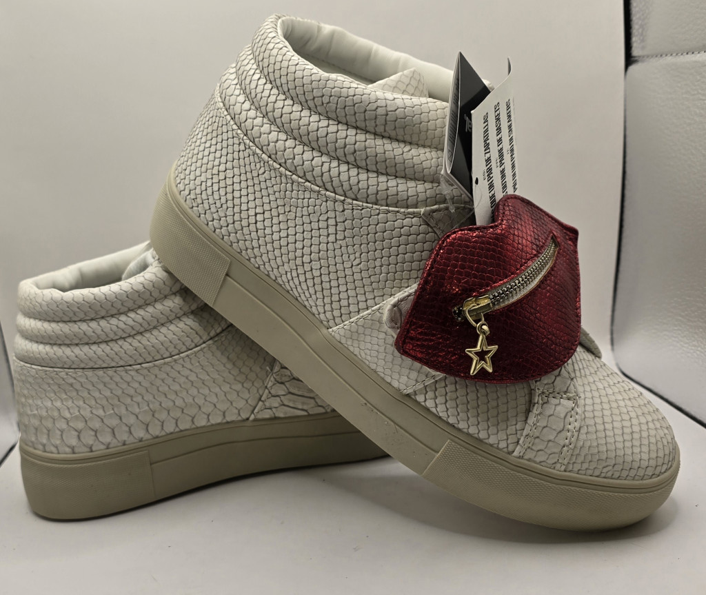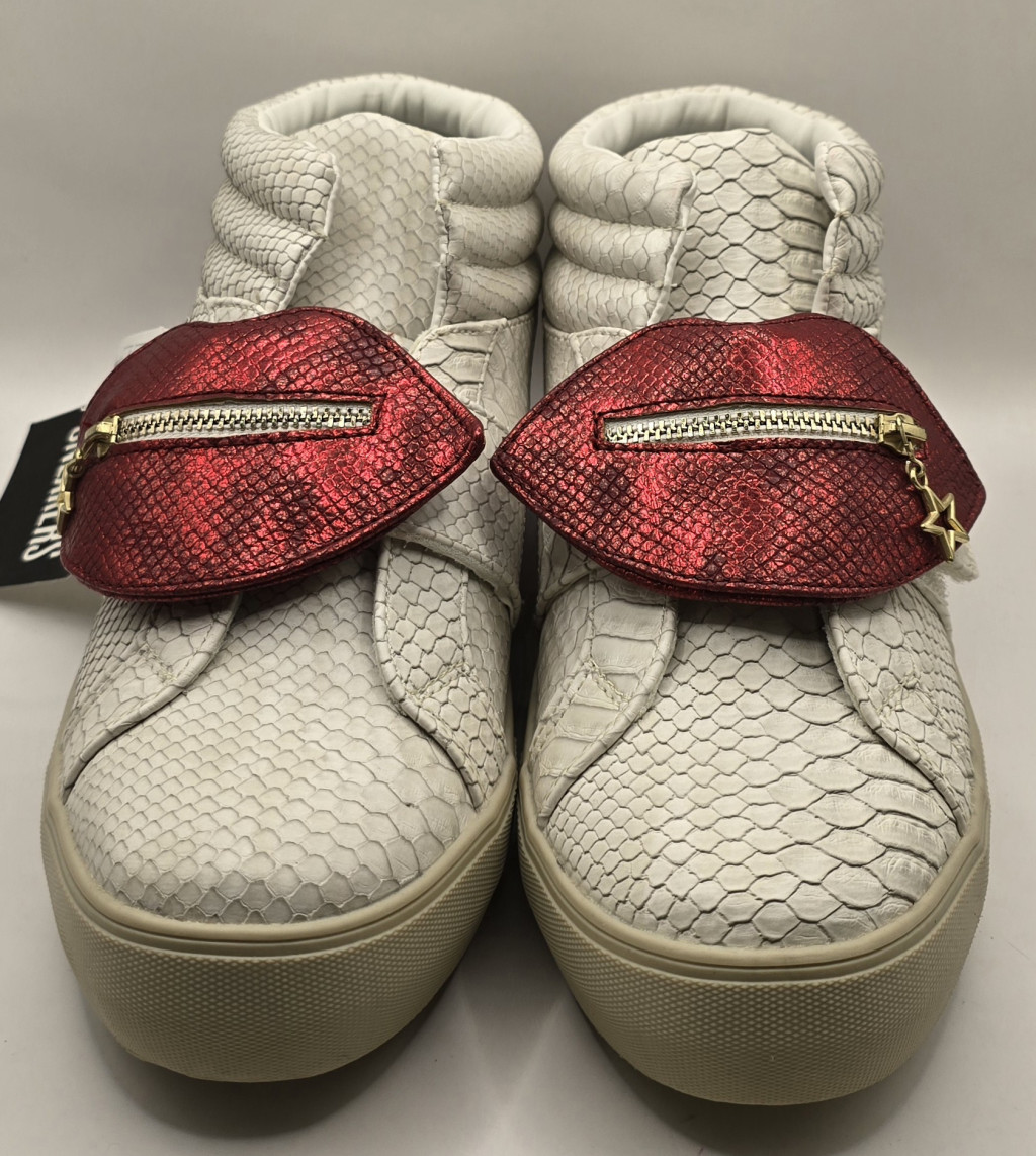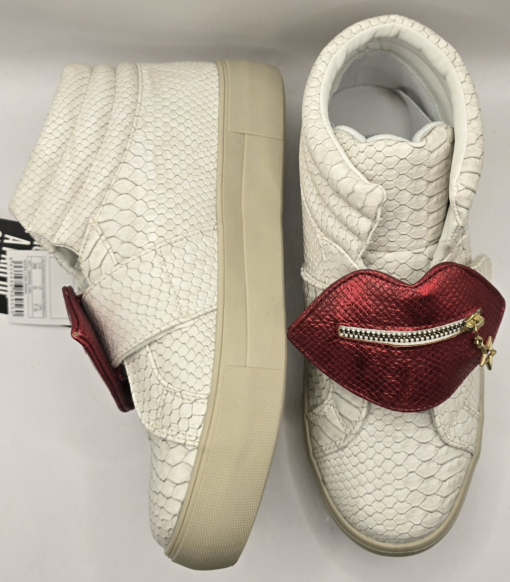 Ez a Desigual sneaker azoknak készült, akik nem félnek kitűnni a tömegből. A cipő különlegessége a kígyóbőr mintázatú, texturált fehér felsőrész, amelyet egy levehető, vörös metálfényű, ajak formájú dísz tesz igazán egyedivé. A díszen található apró cipzár és a csillag alakú medál a márka jól ismert bohém és kreatív világát idézi. A magasított szárú kialakítás és a párnázott boka rész nemcsak stílust, hanem stabil tartást is biztosít a mindennapi városi kalandokhoz.