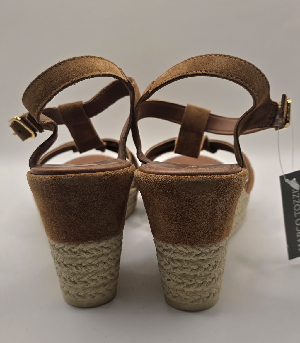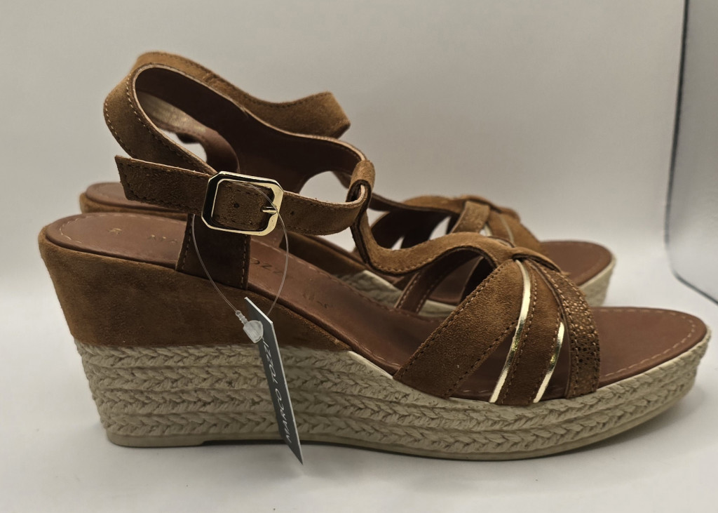 A boka körül állítható csat gondoskodik a stabil tartásról, míg a puha talpbetét és a telitalp kialakítása optimális súlyelosztást tesz lehetővé, így a magasabb sarok ellenére is rendkívül kényelmes viselet. A természetes barna (Cognac) szín remekül kombinálható maxiruhákkal, fehér vászonnadrágokkal vagy akár farmerrel is.