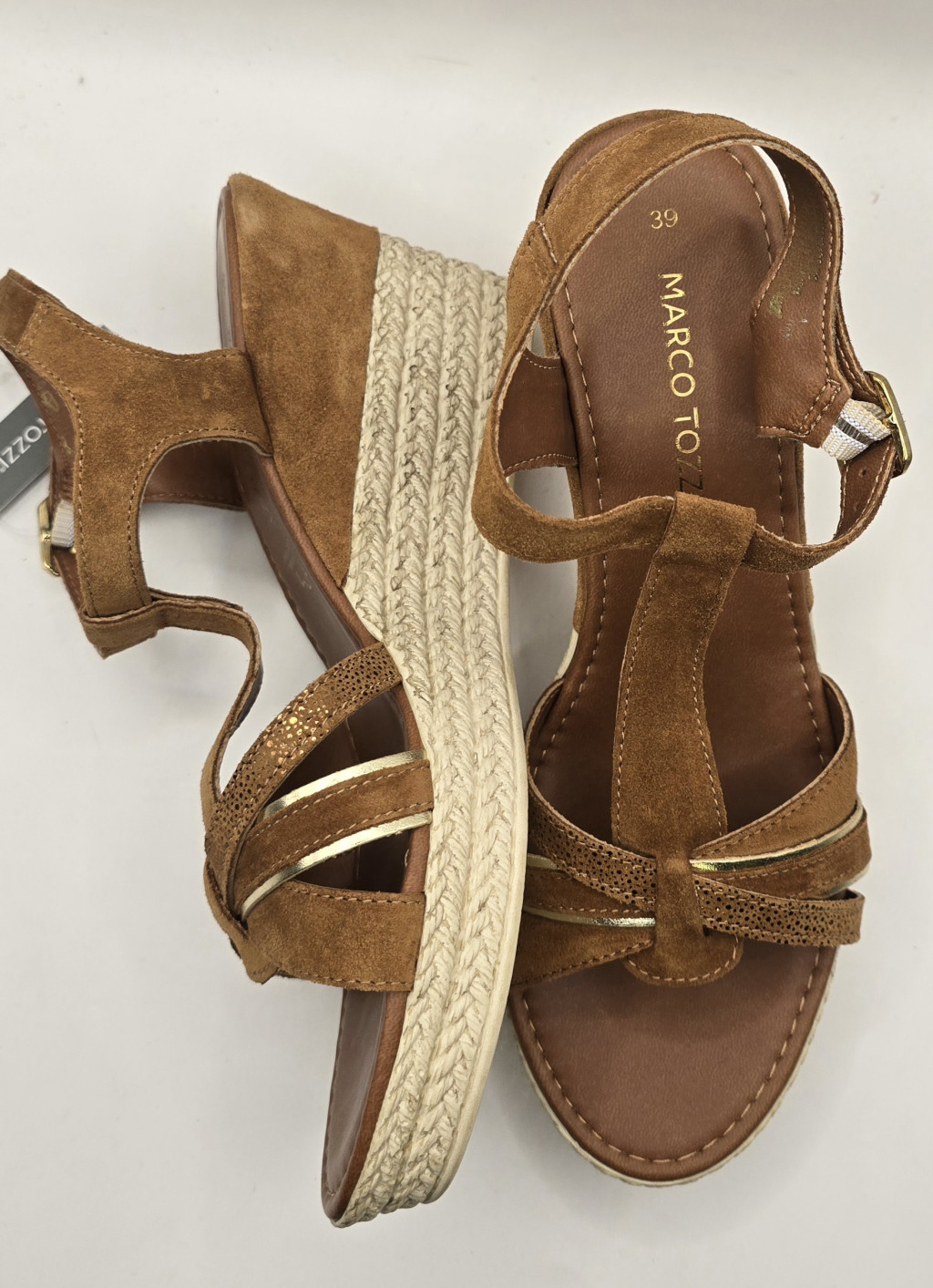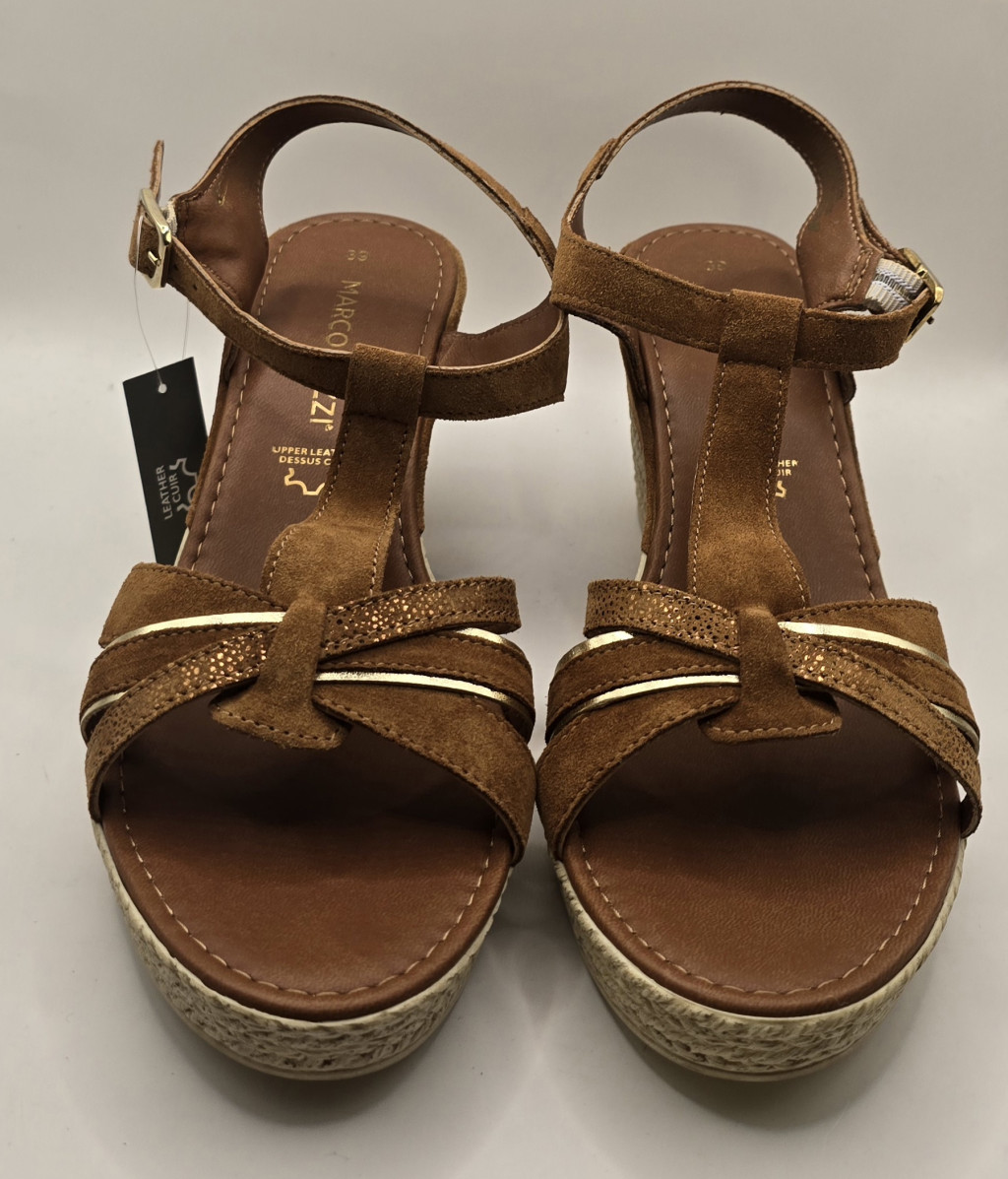 Emelje ki nyári szettjeit ezzel a prémium megjelenésű, Marco Tozzi éktalpú szandállal! A lábbeli különlegessége a fonott textúrájú talp és a finom megmunkálású pántrendszer, amelyet elegáns arany csíkok és texturált betétek tesznek még vonzóbbá.