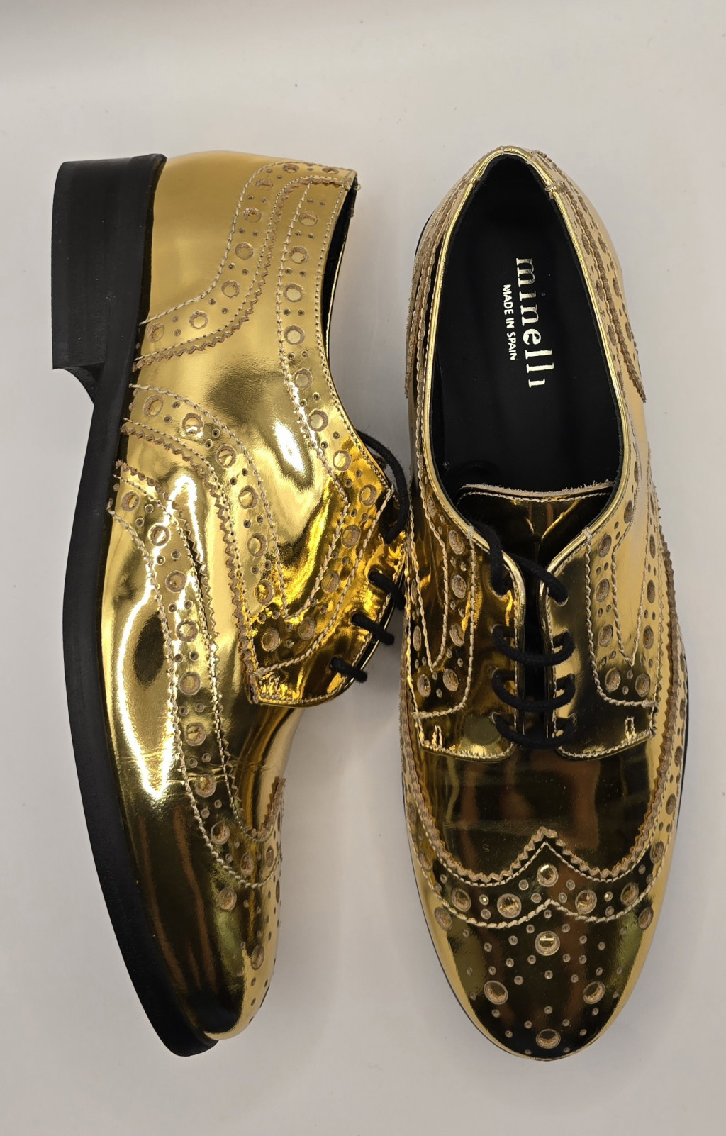 A Minelli Lyssa félcipő stílusos és modern választás, amely a klasszikus oxford fazont ötvözi a csillogó arany metál színnel. Elegáns, mégis könnyed megjelenést biztosít, így tökéletesen illik hétköznapi és alkalmi összeállításokhoz is. Kényelmes lapos talpa egész napos viselhetőséget nyújt.